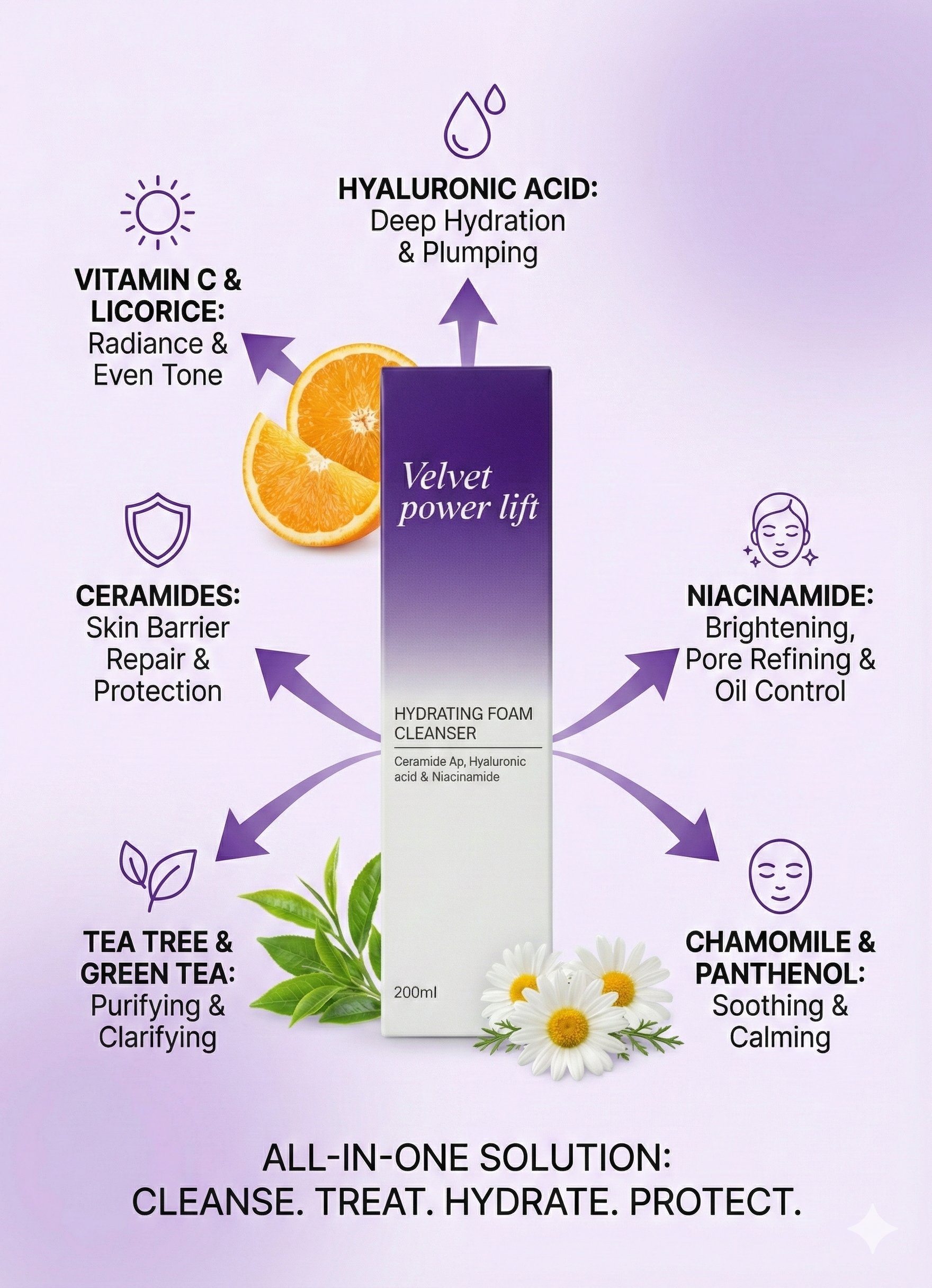 يُعد Velvet Power Lift Hydrating Foam منظفًا للوجه عالي الفعالية ولطيفًا للغاية، صُمم لإزالة الشوائب بعمق مع الحفاظ على حاجز الرطوبة الطبيعي للبشرة. تعتمد تركيبته على مزيج متكامل من مشتقات فيتامين C والمستخلصات النباتية وعوامل الترطيب والمكونات المهدئة، ليترك البشرة منتعشة وناعمة وأكثر إشراقًا بعد كل استخدام.