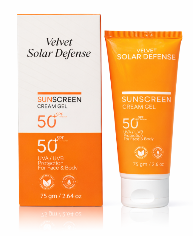 يوفر Velvet Solar Defense Sunscreen Cream Gel SPF 50+ حماية عالية الأداء من أشعة الشمس UVA وUVB بتركيبة خفيفة وسريعة الامتصاص وغير دهنية، مناسبة لجميع أنواع البشرة. تعتمد هذه التركيبة على مزيج متكامل من فلاتر الأشعة فوق البنفسجية الحديثة والمكونات الغنية بمضادات الأكسدة، مما يساعد على حماية البشرة من حروق الشمس وعلامات الشيخوخة الضوئية والبقع الداكنة والعوامل البيئية الضارة، مع الحفاظ على ترطيب البشرة طوال اليوم.