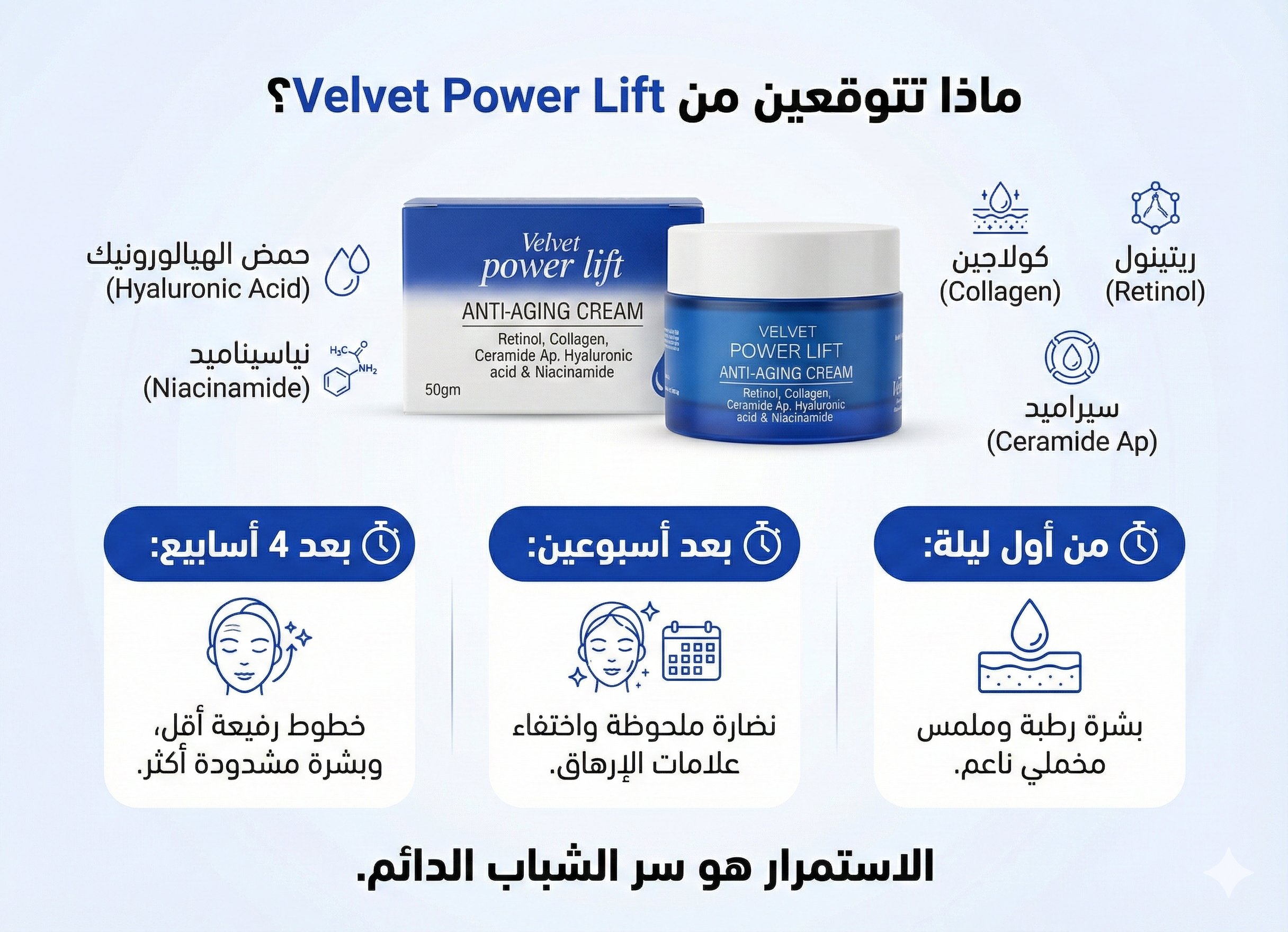 Velvet Power Lift Cream is a high-performance, multi-functional formula designed to restore youthful vitality, smoothness, and radiance to the skin. Powered by a unique combination of clinically trusted actives, nourishing botanical oils, and barrier-supporting ingredients, it targets the most visible signs of aging while delivering deep hydration and enhanced skin resilience.